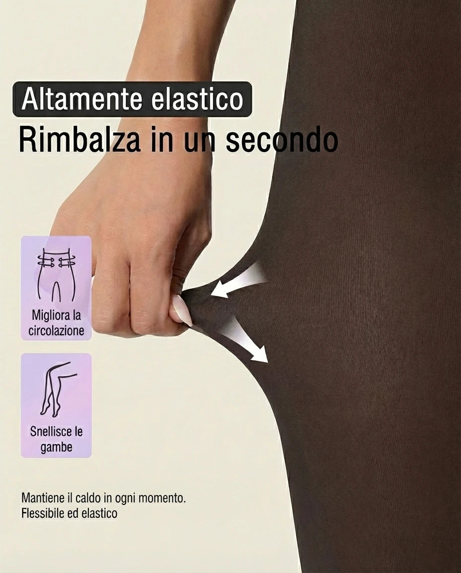 La struttura super-elastica permette al collant di modellarsi al corpo, mantenendo compressione uniforme senza effetto “che blocca la circolazione”.